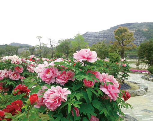 It is an elegant complex well worth your time. You can see seasonal flowers, such as cherry blossoms, peony blossoms, iris flowers, and plum blossoms, as well as autumn leaves. This is a Japanese garden where you can enjoy every season." The entrance of the garden features a cherry‐tree‐lined path, a square with peonies, and red leaves (in autumn).