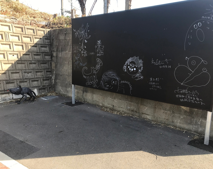 Here you will find a flag designed by illustrator Seitaro Kuroda in the motif of Sakubei Yamamoto's coal mine paintings, an iron monument “Sekitan-kun” made by Masaji Sonoda which is based on a black dog picture drawn by Mr. Kuroda, as well as a "signboard" for artists and celebrities to sign.