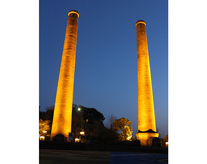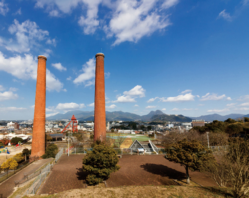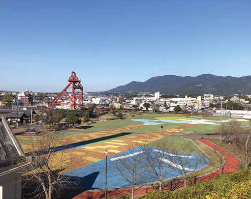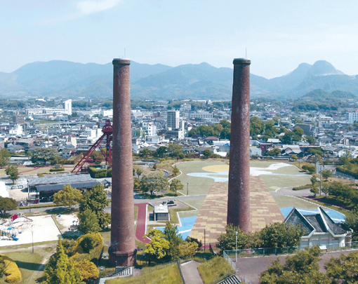 This park in Tagawa built on the original construction site is symbolized by the two chimneys and the Ita vertical shaft tower which represent the historical heritage of the site. They are registered as intangible cultural assets of Japan and are also considered assets of Japan’s industrial revolution during the Meiji period (1868 – 1912). The Tagawa Coal Mine Festival (Tanko-bushi Matsuri) is held here at the birthplace of Tanko Bushi (a Japanese folk song about coal mining). In 2018, the site including the Ita vertical shaft of Mitsui Tagawa Mining Station, was designated as a national historic site of the Chikuho Coalfield Ruins. The Coal Mine Festival held on the first Sunday of November is enlivened by a mass Tanko-bushi dance. If you walk up the hill you can enjoy a panoramic view of Mt.Kawaradake as well as the ground drawings of the two chimneys. You can take impressive photos from any angle!