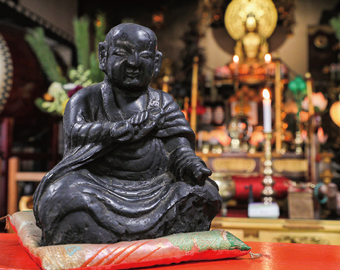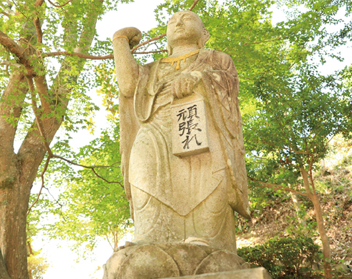 Go through the approach that continues from the residential area to the temple precincts, where expressive stone images of Jizo (a guardian deity of children) are scattered. Many wind chimes are suspended in this temple from May through September and is also a popular spot to view the changing colors of the autumn leaves. One of the popular Jizo is named “Guts-Pose Jizo.”. The term “guts-pose” means victory pose and is now commonly used in the Japanese language. There are many photogenic and scenic spots located throughout the temple which are great for posting to social media. The main hall of Mitsuidera Temple which was built to hold memorial services for the mine workers is enshrined with a statue of Sekitan Daishi (lit. Great Priest of Coal) made of coal.