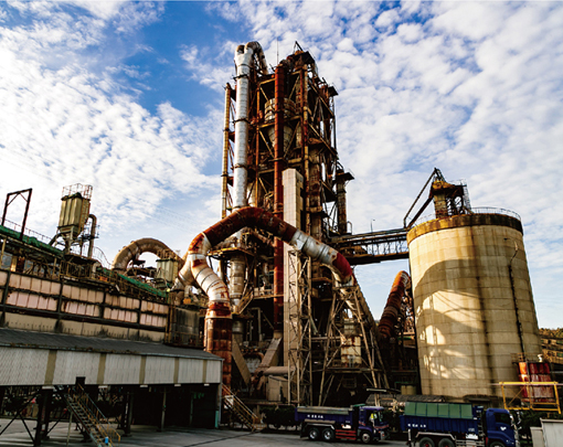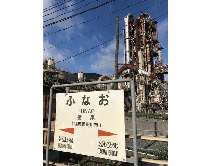 It can clearly be seen from the station platforms. When people stand on the platforms of Funao Station, the huge Tagawa plant of Aso Cement stands in front of them. The scene of the approaching plant looks as if it were a different world.